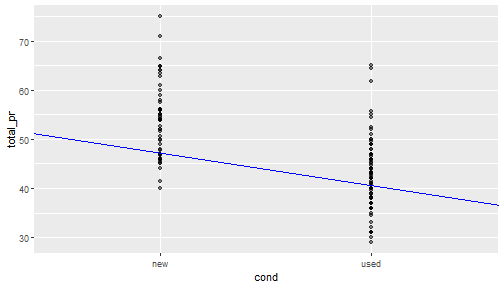 ## Rows: 141## Columns: 12## $ id <dbl> 150377422259, 260483376854, 320432342985, 280405224677, 17~## $ duration <int> 3, 7, 3, 3, 1, 3, 1, 1, 3, 7, 1, 1, 1, 1, 7, 7, 3, 3, 1, 1~## $ n_bids <int> 20, 13, 16, 18, 20, 19, 13, 15, 29, 8, 15, 15, 13, 16, 6, ~## $ cond <fct> new, used, new, new, new, new, used, new, used, used, new,~## $ start_pr <dbl> 0.99, 0.99, 0.99, 0.99, 0.01, 0.99, 0.01, 1.00, 0.99, 19.9~## $ ship_pr <dbl> 4.00, 3.99, 3.50, 0.00, 0.00, 4.00, 0.00, 2.99, 4.00, 4.00~## $ total_pr <dbl> 51.55, 37.04, 45.50, 44.00, 71.00, 45.00, 37.02, 53.99, 47~## $ ship_sp <fct> standard, firstClass, firstClass, standard, media, standar~## $ seller_rate <int> 1580, 365, 998, 7, 820, 270144, 7284, 4858, 27, 201, 4858,~## $ stock_photo <fct> yes, yes, no, yes, yes, yes, yes, yes, yes, no, yes, yes, ~## $ wheels <int> 1, 1, 1, 1, 2, 0, 0, 2, 1, 1, 2, 2, 2, 2, 1, 0, 1, 1, 2, 0~## $ title <fct> "~~ Wii MARIO KART & WHEEL ~ NINTENDO Wii ~ BRAND NEW ~total_pr) at which a game is sold? cond) as the only predictor:cond) as the only predictor:lm_fit <- lm(total_pr~cond,data=mariokart)summary(lm_fit)